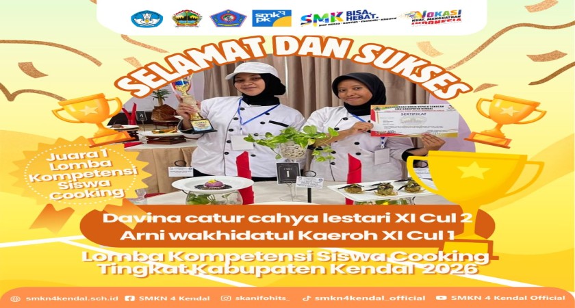 Tim Kuliner SMKN 4 Kendal berhasil menyabet gelar Juara 1 dalam ajang LKS Cooking Tingkat Kabupaten Kendal 2026. Kemenangan ini diraih berkat kerja keras dan kreativitas dua siswi berbakat: