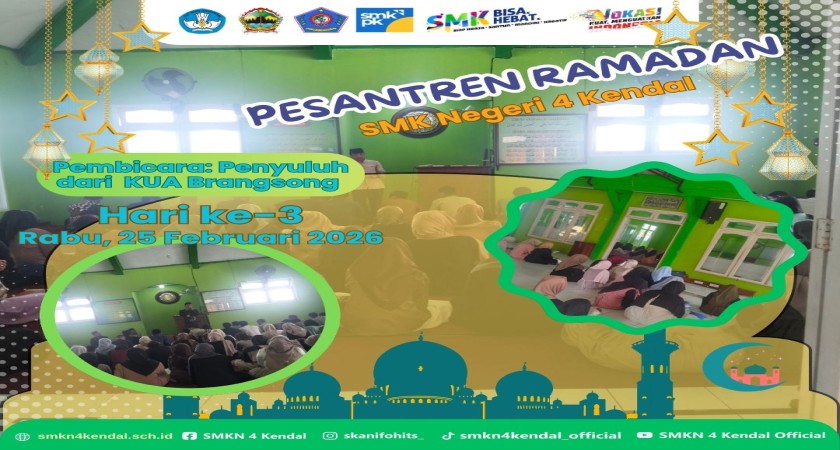 KENDAL (23 Februari 2026) – SMK Negeri 4 Kendal resmi memulai rangkaian kegiatan Pesantren Ramadhan 1447 H di Masjid Darul Ulum. Pada hari pertama, kegiatan dikhususkan bagi siswa
